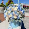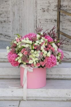 One of our best sellers and highly desired arrangement, this beauty is full of tasteful shades of pink and will surely bring sweet smiles to the lucky recipient! The arrangement was made with gorgeous shades of pink spray roses, white roses, white ranunculus, rice flowers, brunia, pink hydrangea and pink stock. Show them your softer side with this artful and memorable gift.This version is made in the large round box.